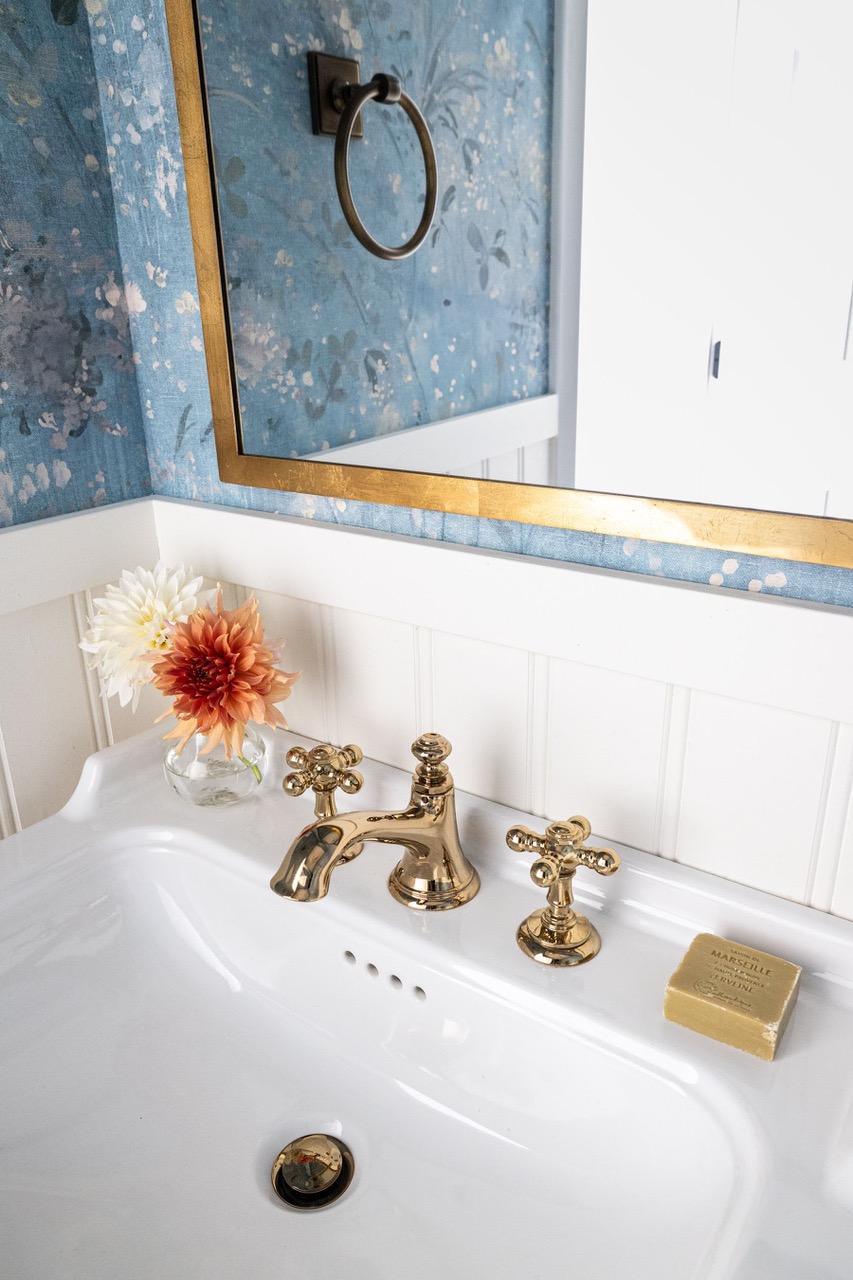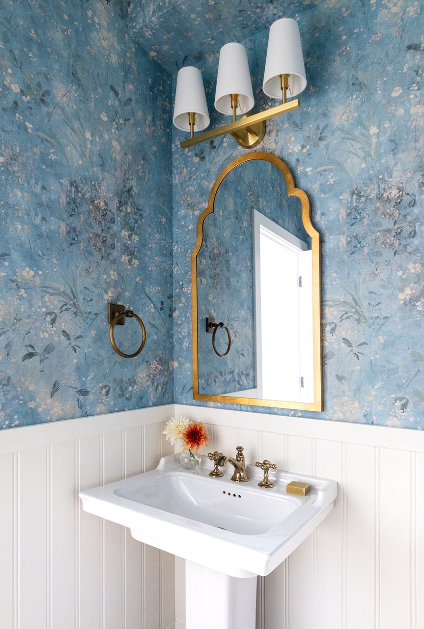 The powder room was refreshed with new plumbing, lighting, and accessories. By introducing millwork and a beautiful wallpaper, the space was lightened and elevated while retaining a sense of character.
