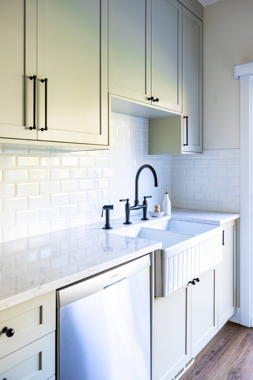 The kitchen was fully updated, with all cabinets (including the island) replaced to provide better storage and more efficient use of the space. Upper cabinets extend to the ceiling, while an integrated hood fan blends seamlessly with the design. We added new countertops, backsplash, appliances, and plumbing fixtures to complete the look.